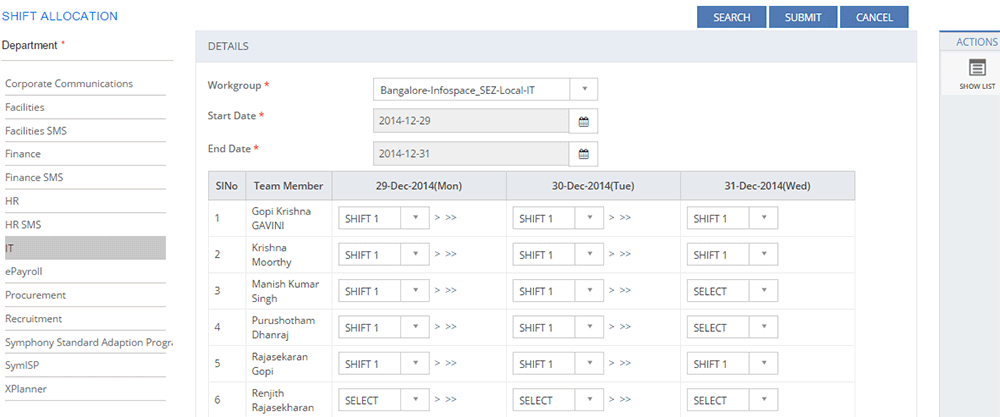 Click SHOW LIST to display the LIST table showing all the configured Shift Masters for the selected Tenant.