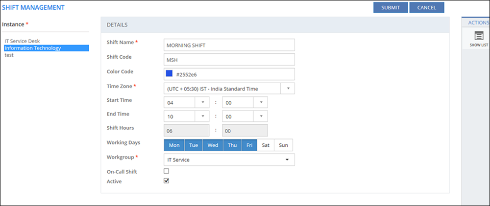 Click SHOW LIST to display the LIST table showing all the configured Shifts for the selected Tenant.
