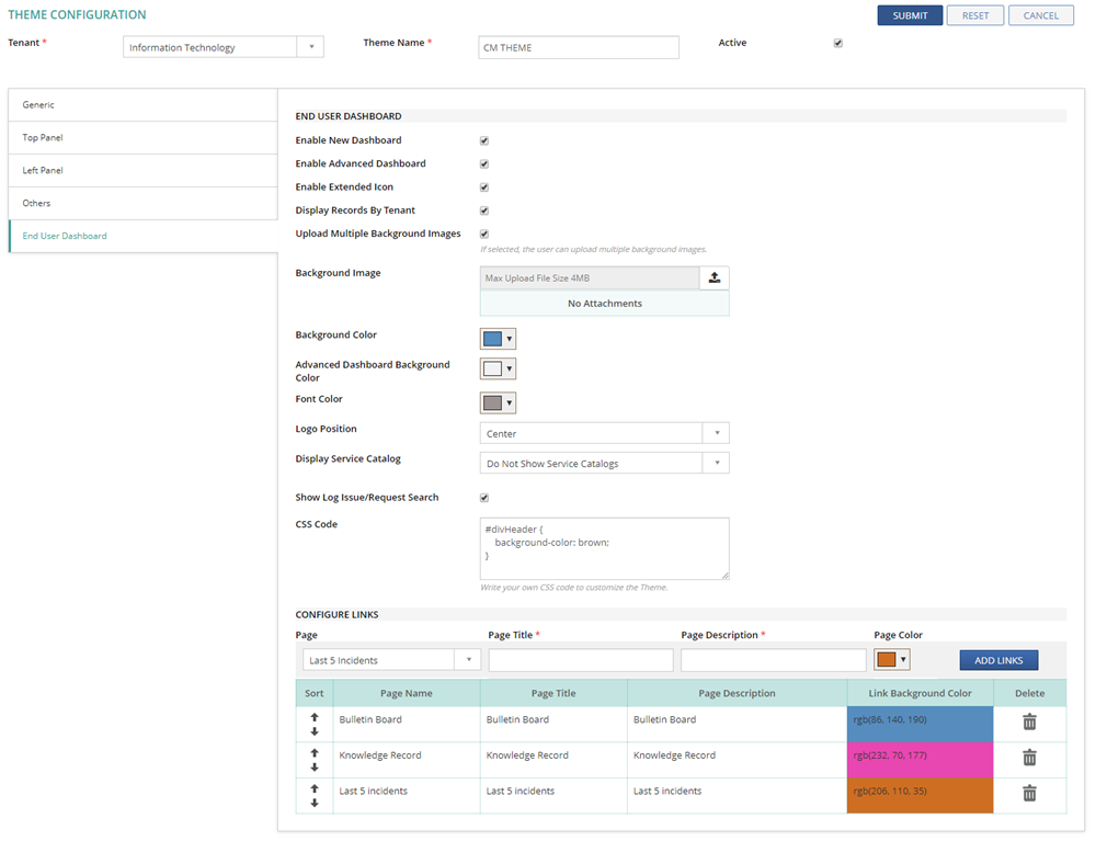 Specify the CSS code to customize the End User Dashboard themes such as fonts, colors, etc. This customization can be done in addition to the regular theme configuration. Note: Developer knowledge is required to use this feature. |